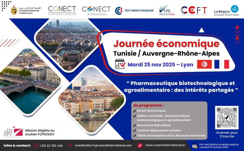 تواصل كونكت الدولية البحث عن عقد الشراكات المفيدة للاقتصاد التونسي خاصة من ناحية توفير العبور الاقوى لصادراتنا او من ناحية تيسير الطريق امام الاستثمارات التونسية للوصول الى شراكات رابحة. في هذا الاطار ستنظم كونكت الدولية يوم الثلاثاء 25 نوفمبر 2025 بالتعاون مع قنصلية تونس في مدينة ليون الفرنسية والمجلس الإقليمي لأوفرن-رون-ألب اليوم الاقتصادي لتونس بهذه الجهة الفرنسية ذات الحركية الاقتصادية المهمة وسيكون اليوم تحت شعار “الصناعات الدوائية، والتكنولوجيا الحيوية، والصناعات الغذائية الزراعية: مصالح مشتركة” هذا الحدث سيتم ايضا بالشراكة مع وكالة النهوض بالاستثمار الأجنبي (FIPA) – مكتب تونس في فرنسا، وغرفة التجارة والصناعة التونسية الفرنسية (CCITF) وغرفة التجارة الفرنسية التونسية في أوفيرن-رون-ألب (CCFT AURA) يهدف هذا اليوم الاقتصادي لتونس إلى تعزيز المبادلات الاقتصادية والاستثمارات المتبادلة بين تونس وإحدى أكثر المناطق ديناميكيةً وتطورًا صناعيًا في أوروبا، والتي تشتهر بمنظومة الابتكار والبحث العلمي وتجمعات التكنولوجيا، وحضورها القوي في قطاعات الصحة والتكنولوجيا الحيوية والصناعات الغذائية والكيمياء الخضراء والانتقال الطاقي. كما سيكون في برنامج فعاليات هذا اليوم عقد منتدى اقتصادي تونسي فرنسي سيحتوي على ورش عمل متخصصة في الصناعات الدوائية، والتكنولوجيا الحيوية، والأغذية الزراعية كما سيتم عقد اجتماعات عمل بين المستثمرين التونسيين ونظرائهم الفرنسيين اضافة الى تنظيم زيارات لشركات وستمكن هذه الفعاليات من تحديد فرص الاستثمار، و التصديرالوصول إلى تواصل عملي موجه نحو اهداف مفيدة للطرفين وضبط برنامج اقتصادي رفيع المستوى مع عرض الخبرة التونسية في منطقة ذات إمكانات صناعية وعلمية قوية كما سيشكل هذا اليوم الاقتصادي فرصة فريدة للشركات التي تتطلع إلى ترسيخ حضورها، أو التصدير إلى فرنسا أو التعاون مع المؤسسات الواقعة في منطقة ليون.