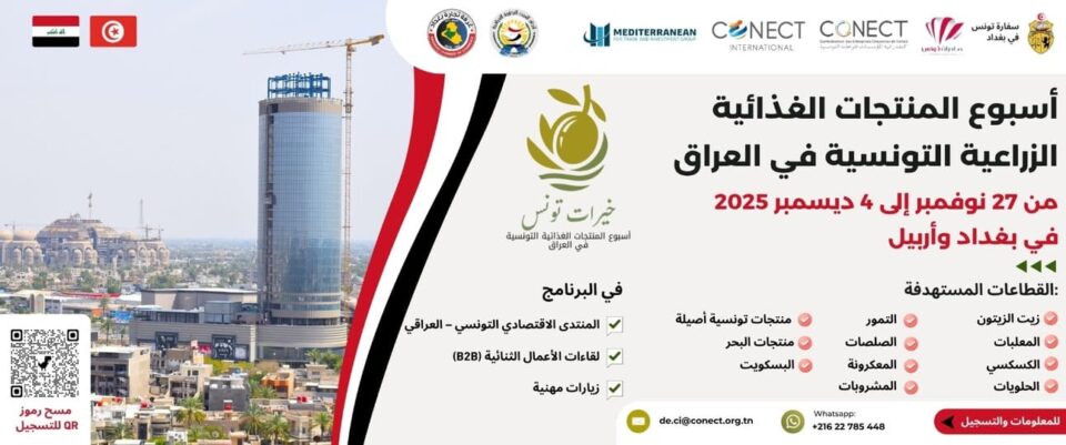 تحت اشراف سفارة الجمهورية التونسية في بغداد وبالتعاون مع مركز النهوض بالصادرات تنظم كونكت الدولية ومجمع MFTI بالشراكة مع اتحاد الغرف التجارية العراقية وغرفة تجارة بغداد فعالية “اسبوع المنتجات الغذائية التونسية في العراق – خيرات تونس” خلال الفترة من 29 الى 30 نوفمبر 2025 بالعاصمة بغداد و2 ديسمبر 2025 بمدينة اربيل عاصمة اقليم كردستان العراق.