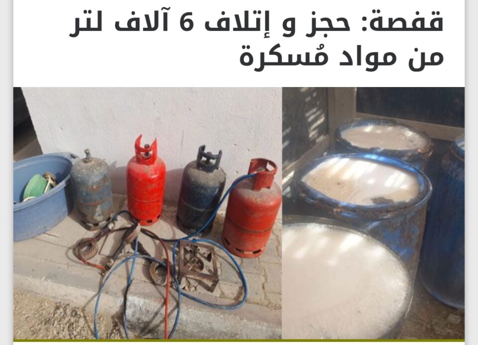 وقد تم حجز حوالي 6000 لترا من هذه المادة، ومعدات التحويل وإيقاف شخصين، مع تسجيل قضية عدلية تتعلق بصنع وتخزين وتهريب مادة مسكرة مضرة بالصحة.