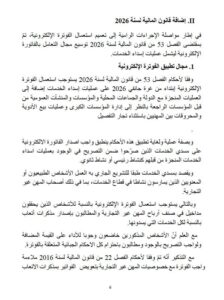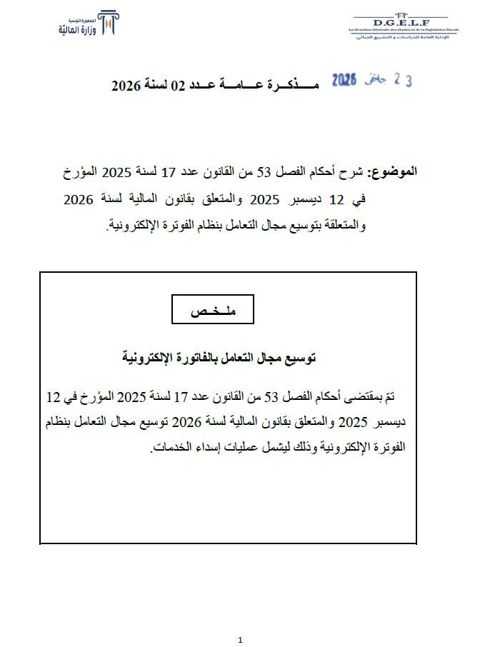 حيث تم بمقتضى أحكام الفصل 53 من القانون عدد 17 لسنة 2025 المؤرخ في 12 ديسمبر والمتعلق بقانون المالية لسنة 2026 توسيع مجال التعامل بنظم الفوترة الالكترونية وذلك ليشمل عمليات إسداء الخدمات.