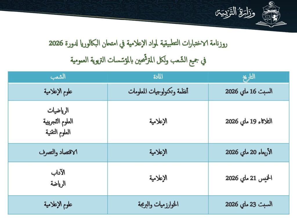 ويقام اختبار في مادة الإعلامية في شعبة الاقتصاد والتصرف يوم الأربعاء 20 ماي 2026، ثم اختبار في نفس المادة يوم الخميس 21 ماي 2026 في شعبتي الآداب والرياضة.