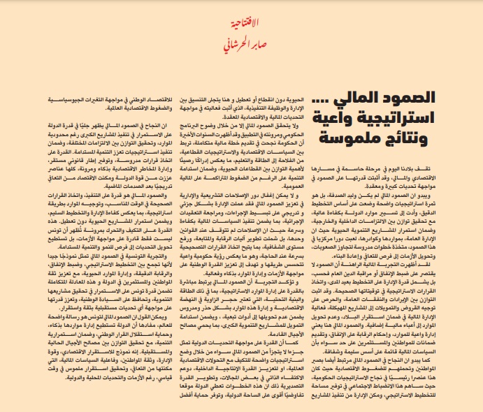 والتجربة التونسية في الصمود المالي تمثل نموذجًا جيدا لأنها تجمع بين التخطيط الاستراتيجي، وضبط الإنفاق، والرقابة الدقيقة، وإدارة الموارد الحيوية، مع تعزيز ثقة المواطنين والمستثمرين في الدولة و هذه المعادلة المتكاملة تضمن قدرة تونس على الاستمرار في تحقيق مشاريعها التنموية، وتحافظ على السيادة الوطنية، وتعزز قدرتها على مواجهة أي تحديات مستقبلية بثقة واستقرار.