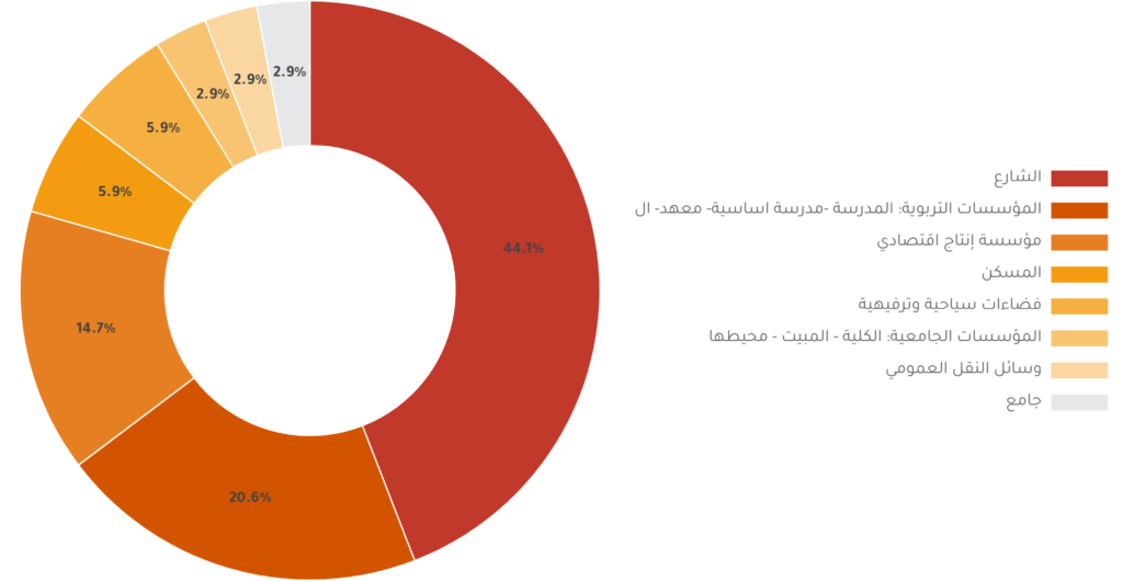 واستحوذت المؤسسات التربوية من معاهد وجامعات ومدارس في المرتبة الثانية، حيث سجلت 20.6% من حالات العنف المرصودة، تليها مؤسسات الإنتاج التي شهدت 14.7% من حالات العنف.