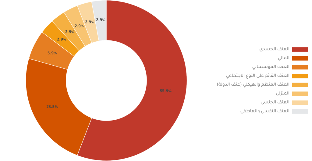 فيما بلغت نسبة العنف المؤسساتي 5.9%، والعنف القائم على النوع الاجتماعي 2.9%، وهي نفس النسبة التي جاء فيها العنف المنظم أو الهيكلي (عنف الدولة) والعنف الجنسي والعنف النفسي والعاطفي والعنف المنزلي.