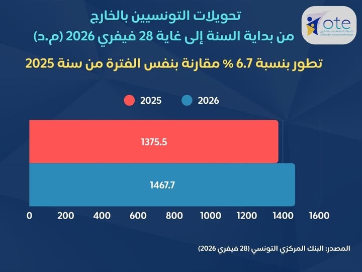 سجّلت التحويلات المالية للتونسيين المقيمين بالخارج خلال الفترة الممتدة من غرة جانفي إلى 28 فيفري 2026، تطورا ملحوظا بنسبة 6.7 % مقارنة بالفترة ذاتها من سنة 2025.
