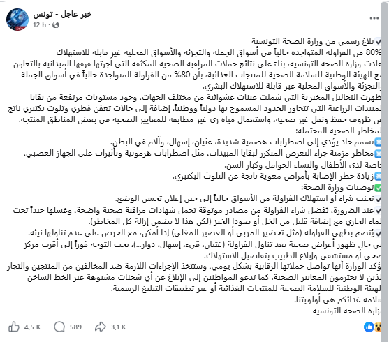 تداولت صفحات على مواقع التواصل الاجتماعي اليوم الثلاثاء 14 أفريل 2026، بلاغا يحذّر من أنّ ” 80% من الفراولة الموجودة حالياً في أسواق الجملة والتجزئة والأسواق المحلية غير قابلة للاستهلاك البشري”.
